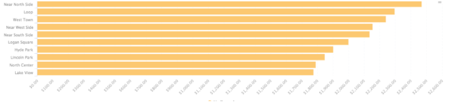 The Near North Side, which encompasses River North, Old Town, the Gold Coast, and the surrounding areas is the most expensive neighbourhood for rental housing during this period with average rents at $2469. This is closely followed by the Loop at $t2296 and West Town at $2240.